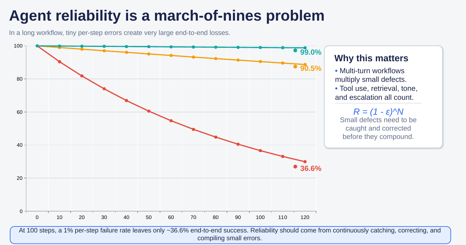 That is the march-of-nines problem (as originally described by Andrey Karpathy). In a long workflow, tiny per-step defects compound into very large end-to-end losses. At 100 steps, a 1% failure rate at each step leaves only about 36.6% end-to-end success; even 0.1% still leaves only about 90.5%. For customer service, regulated operations, and multi-agent workflows, that gap is the difference between a promising demo and a system the business can trust.