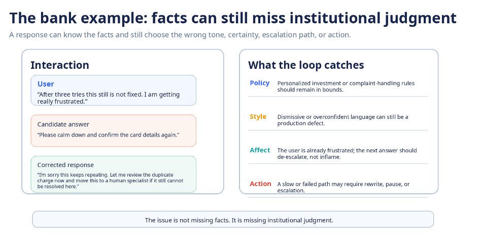 Figure 2. A customer-facing answer can know the facts and still miss the institution’s judgment on policy, style, affect, or action.