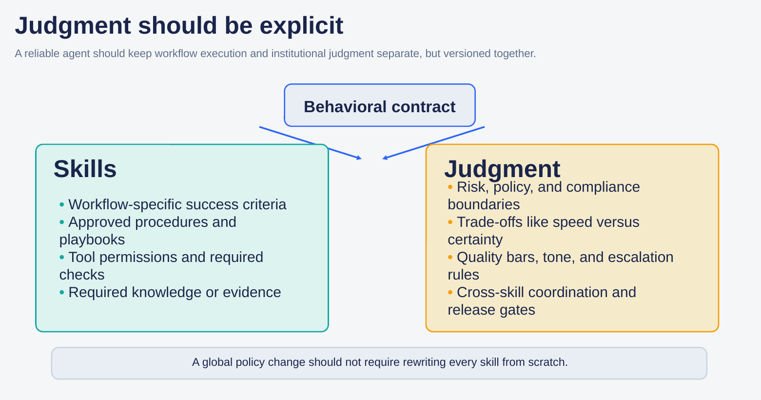 That separation matters because business policy changes faster than workflow logic. If a new escalation rule or compliance boundary requires rewriting every skill from scratch, the system becomes brittle. If judgment is explicit, global changes can be compiled once and enforced across many workflows.
