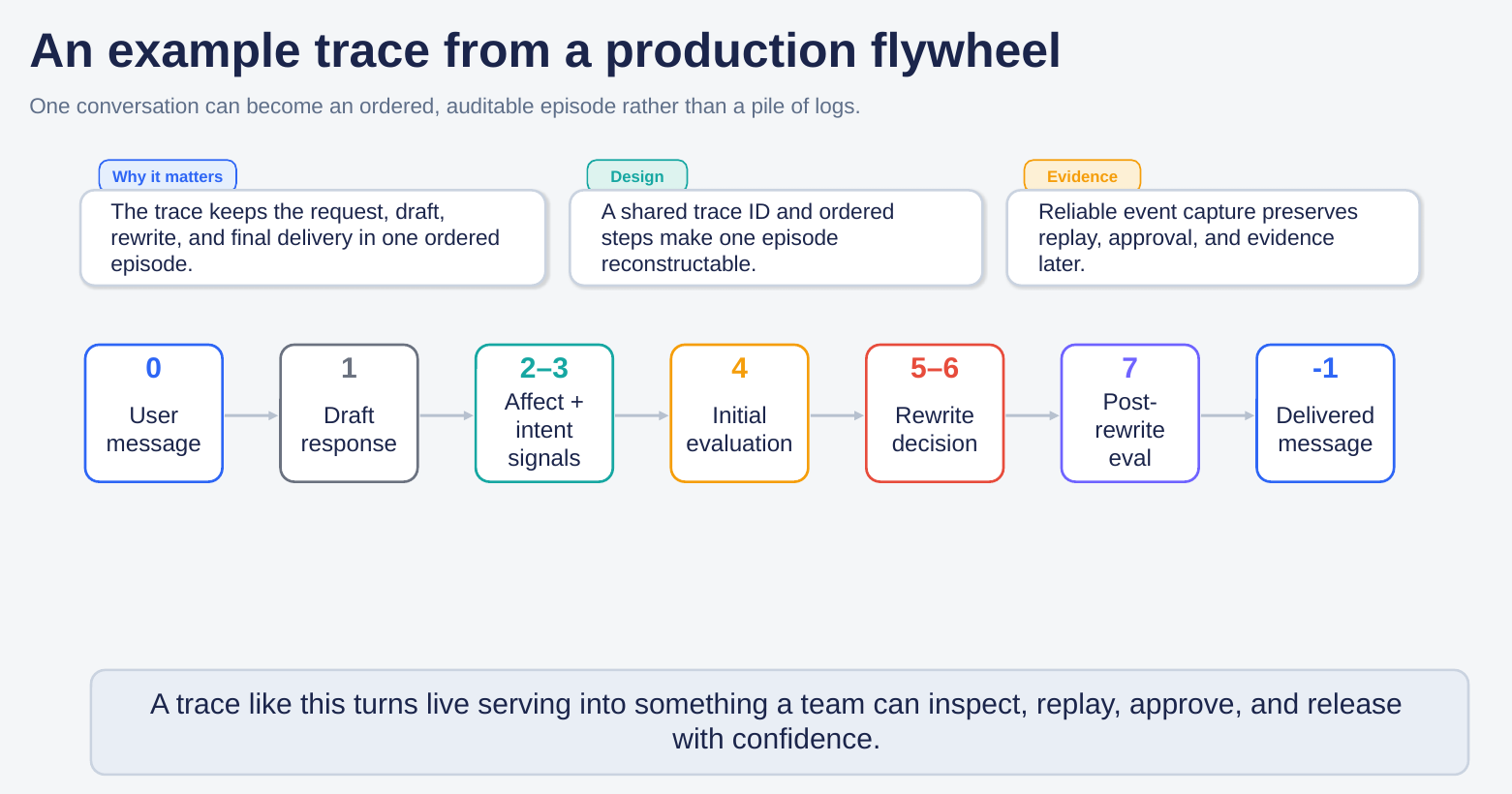 A useful production flywheel is not a vague analytics dashboard. It turns one live interaction into an ordered, auditable episode. In one practical pattern, a conversation becomes: user message → draft response → affect and intent signals → initial evaluation → rewrite decision → post-rewrite evaluation → delivered message.