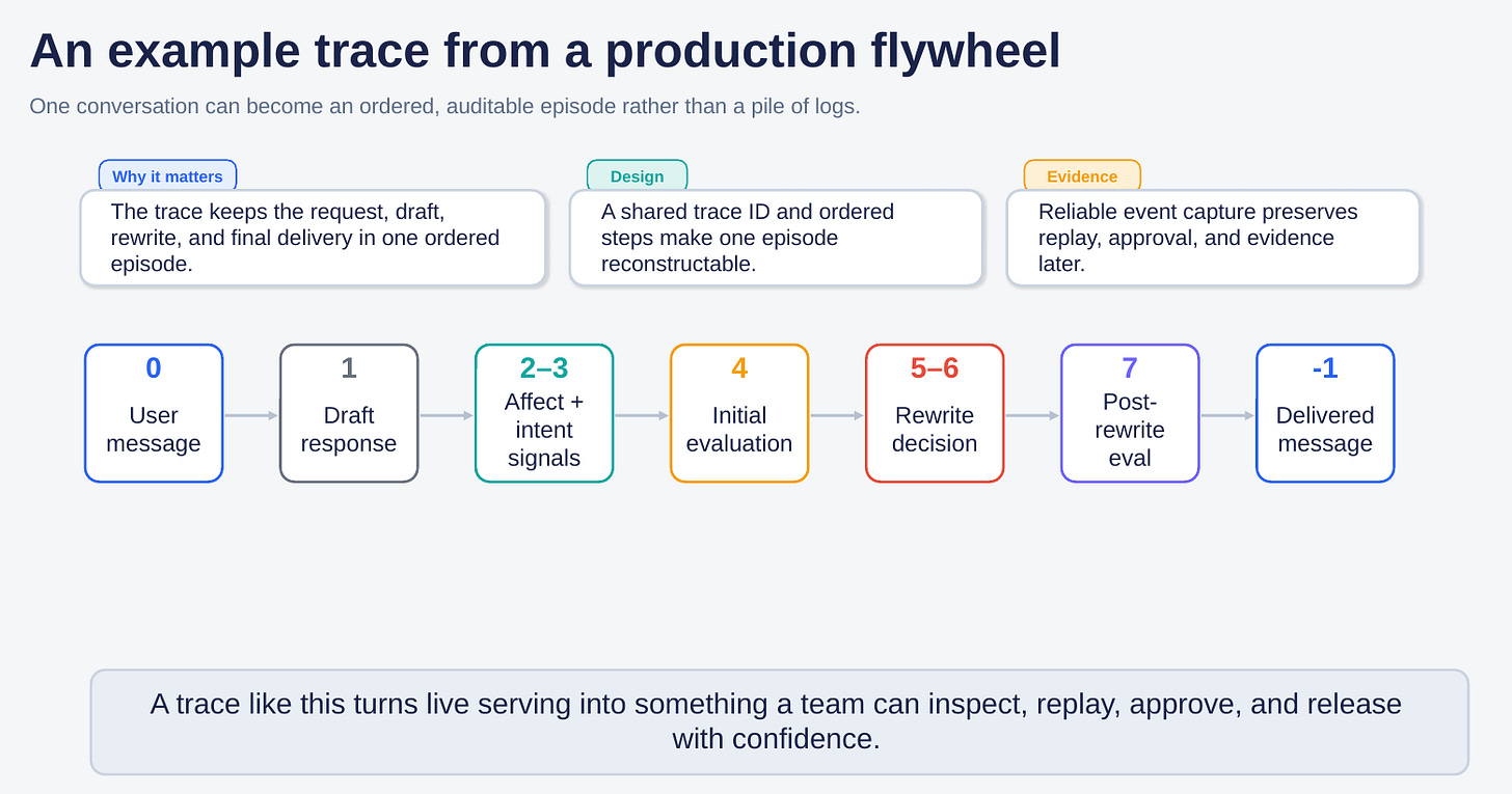 If the team cannot reconstruct which draft was blocked, which rewrite was sent, what evidence triggered the intervention, and which version of the behavioral contract approved the change, then it does not really have a production flywheel. It has prompt folklore.